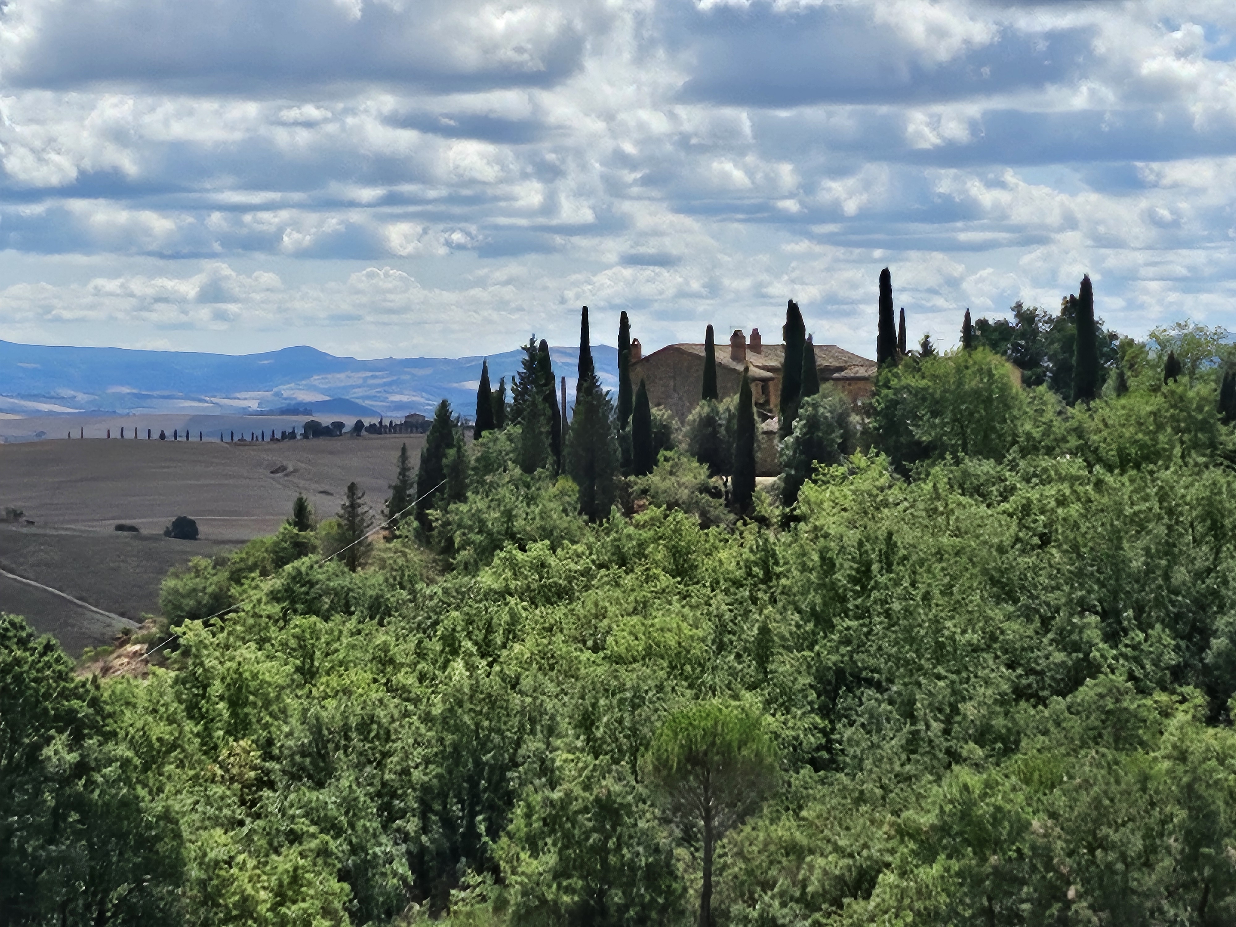 사이프러스 나무가 언덕 위에 어우러지며 마치